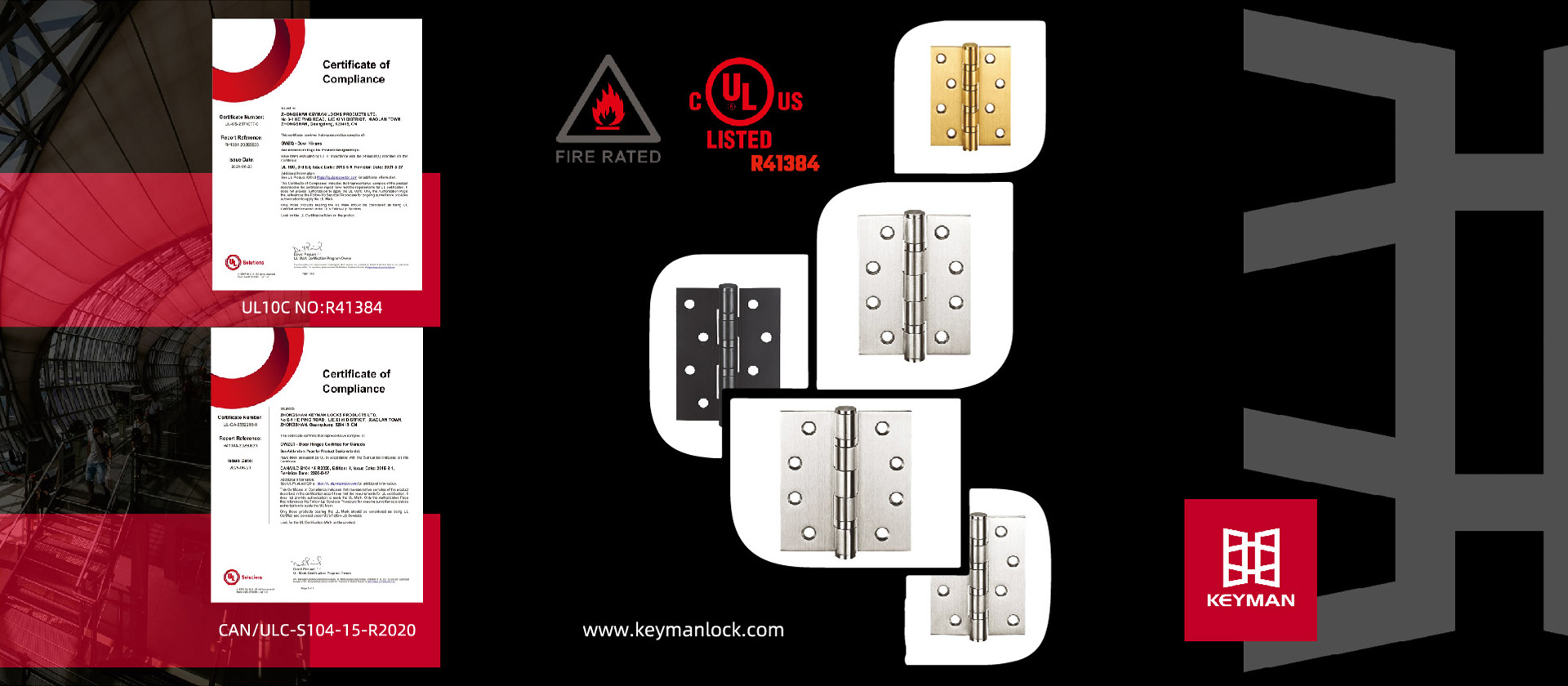 Most of Keyman's products are designed &developed according to ANSI/BHMA's and UL standard.The products are manufactured under the strictest quality and design scheme giving clients and consumers the guarantee hardware of great utility,durability,resistance and a perfect price-quality ratio.