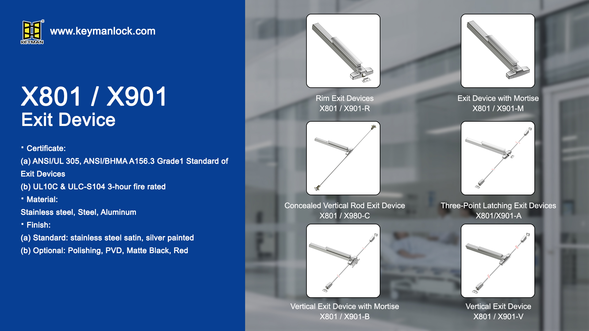 The X801 and X901 Exit Device series from Keyman Lock provides a heavy-duty solution for high-traffic environments. These devices offer superior durability for high-impact applications while meeting the strictest safety standards in the industry. Choosing these specific models ensures your facility remains compliant with critical fire and life safety codes without sacrificing visual appeal.