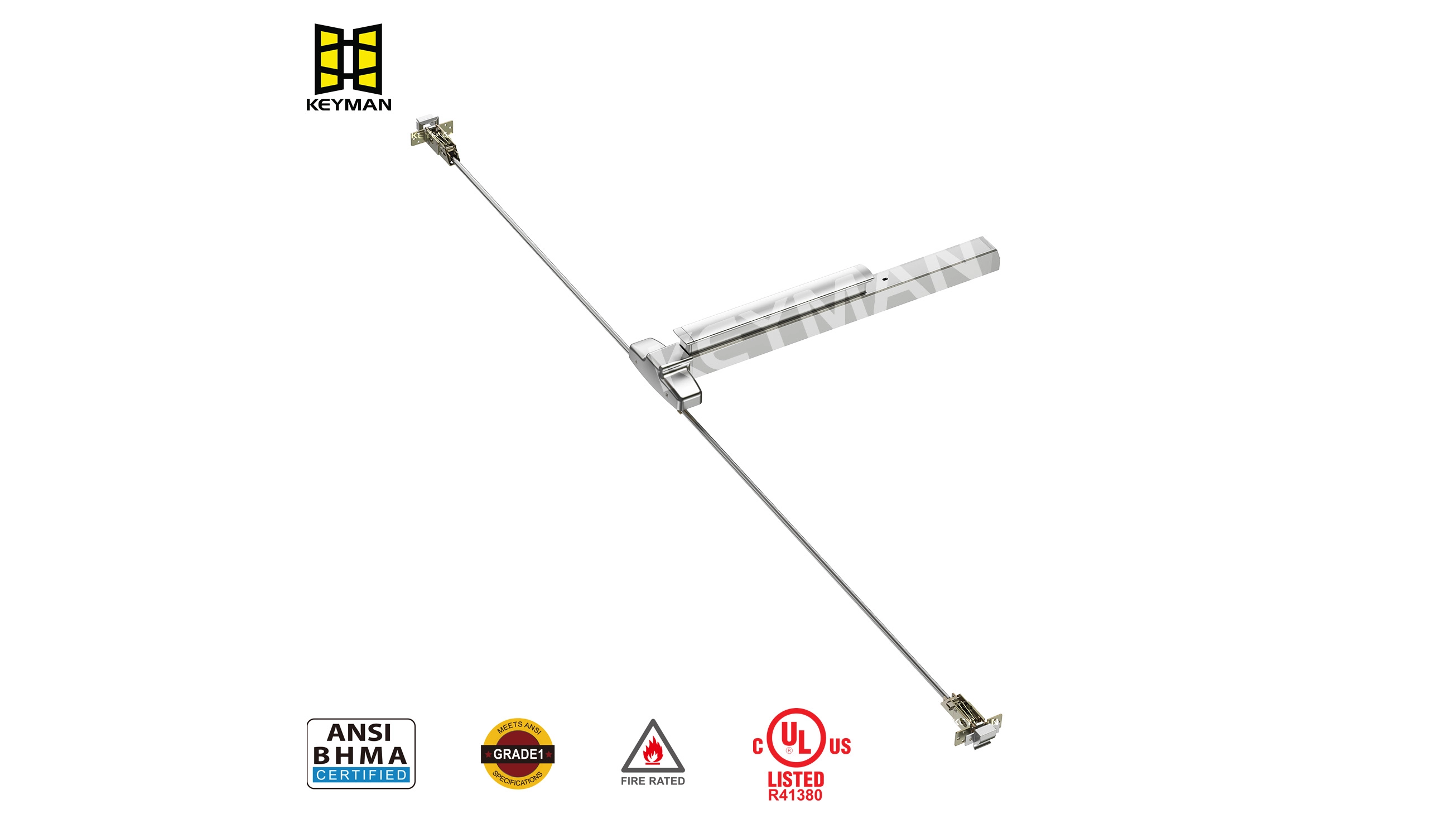 · 立杆(明装或暗装): 对于双开门,常采用立杆装置。这些杆在门的长度上上下延伸,或者在表面上,或者隐藏在门本身内。当按下推杆时,杆会从门框的顶部和底部缩回螺栓,从而使两扇门打开。